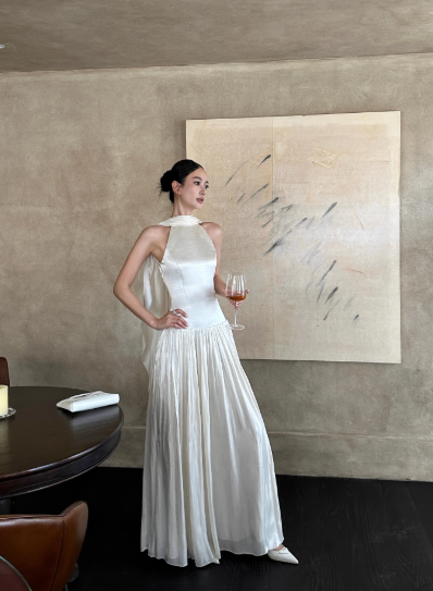 Robe élégante dos nu plissée longueur cheville pour femme, tenue de soirée, d'anniversaire, de rendez-vous, D1854