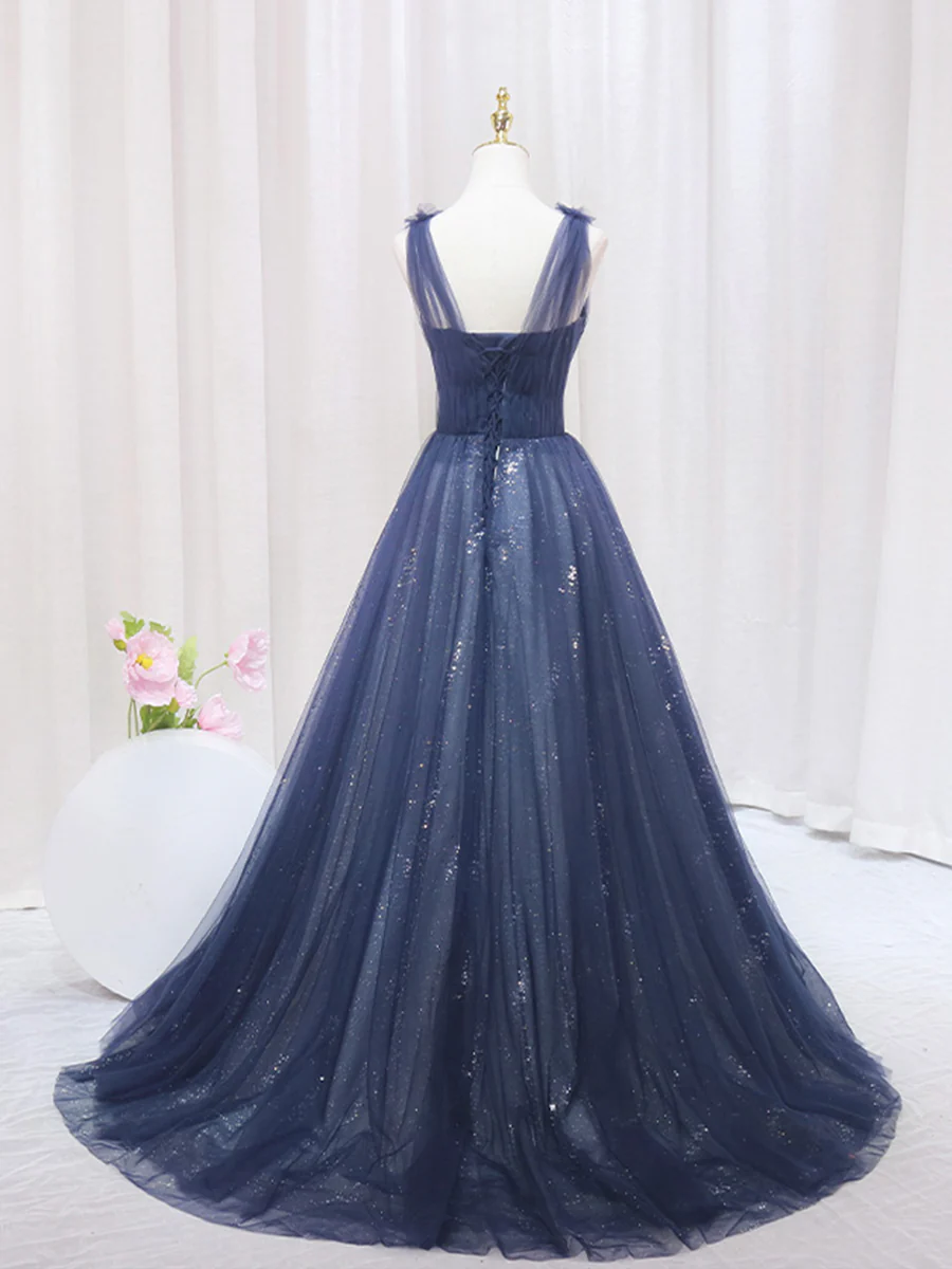 Robe de bal longue élégante en tulle bleu marine à bretelles et coupe trapèze MD7205