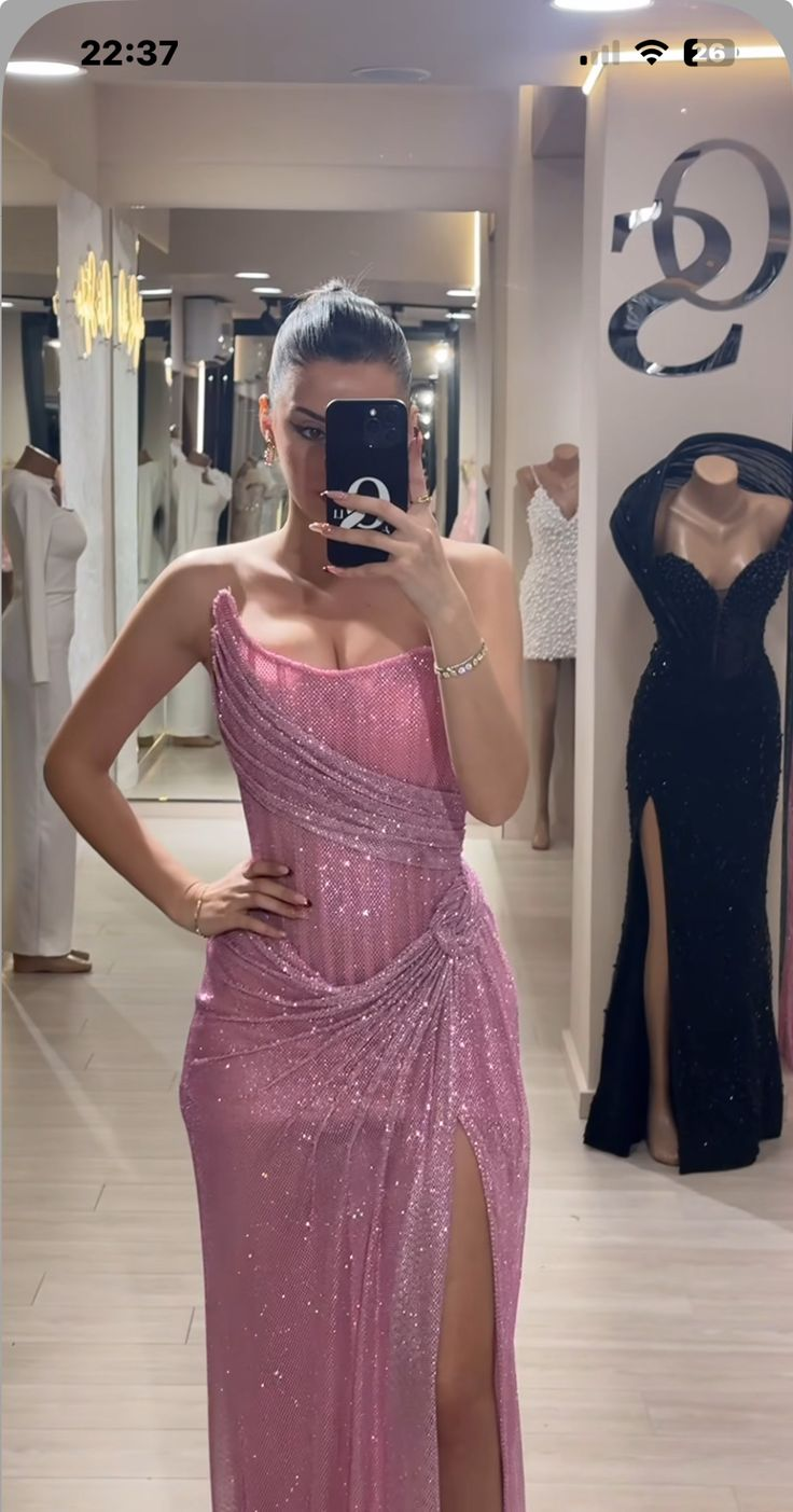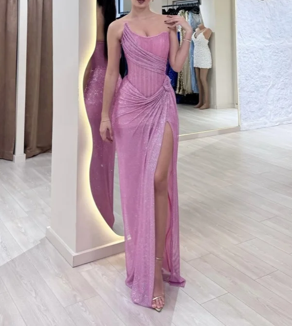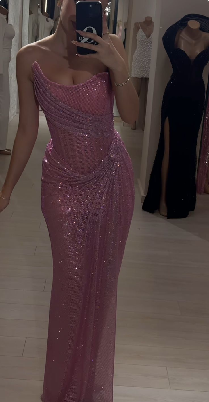 Robe de soirée longue rose élégante, bustier, style sirène, fendue, D1014