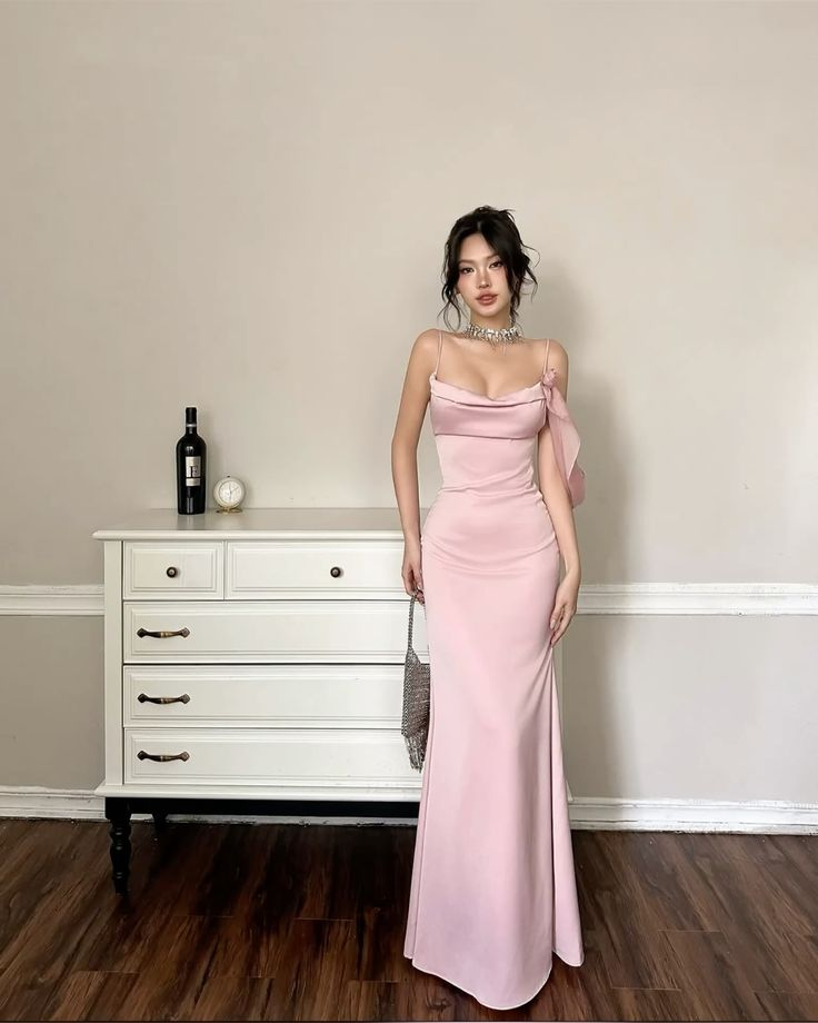 Robe de soirée longue sirène en satin rose à bretelles, élégante, pour invitée de mariage, D1160