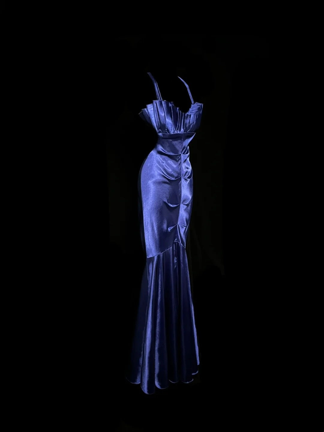Robe de bal élégante bleu marine à bretelles spaghetti, robe de soirée sirène plissée, robe de soirée D2951