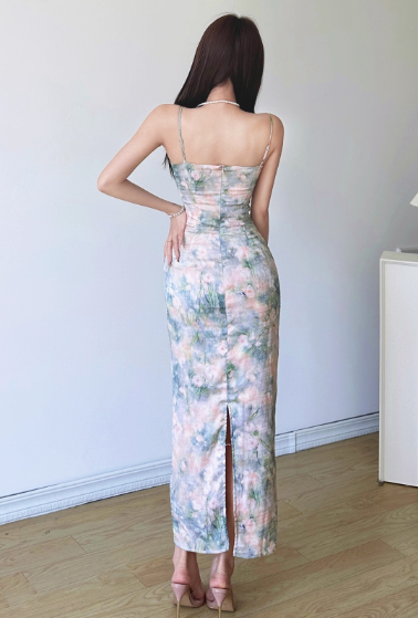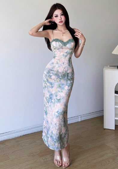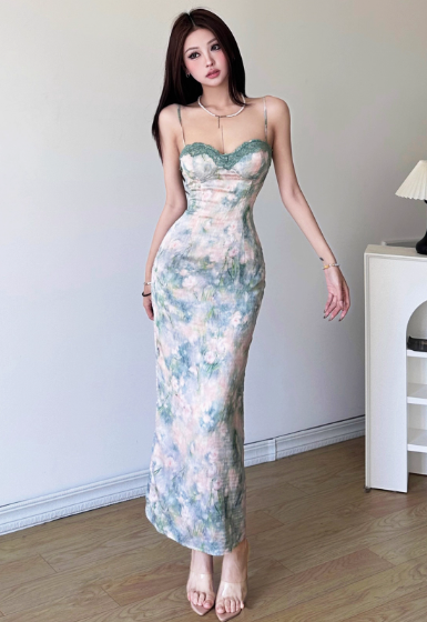 Robe longue élégante à bretelles spaghetti et col en dentelle, imprimé floral, style vacances, robe d'été pour femme, D1838