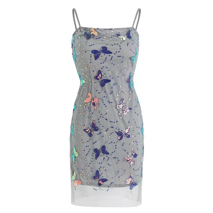 Robe fourreau en mousseline de soie bleu clair, élégante, scintillante, bretelles spaghetti, motif papillon, paillettes, robe de soirée, robe de bal D1564