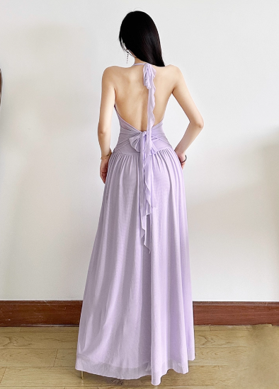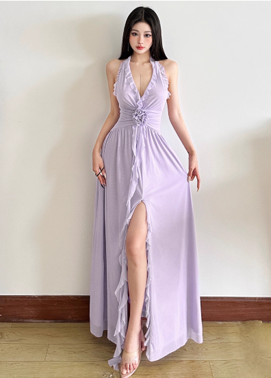 Robe longue d'été élégante à col en V et dos nu, plissée, à volants et fente, pour femme, tenue de bord de mer, D1889