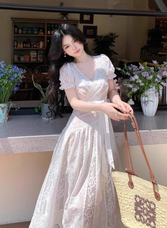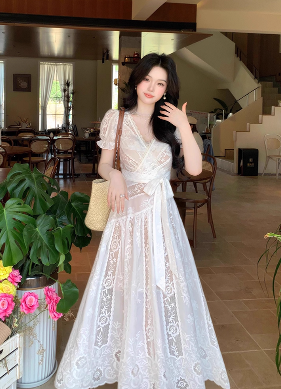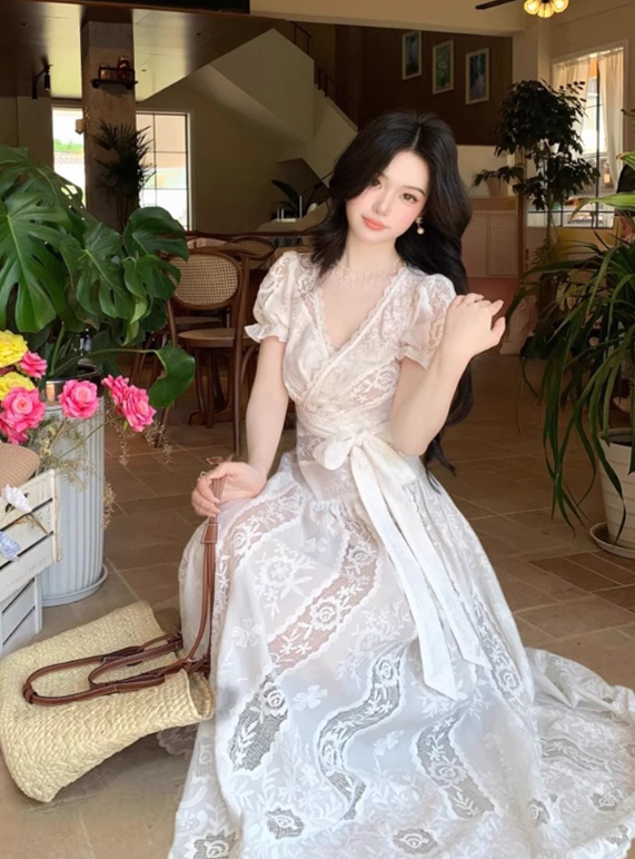 Robe longue élégante à col en V et dentelle brodée à lacets pour femme, tenue de vacances d'été D1994