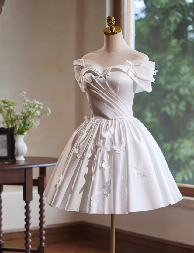 Robe de soirée courte, élégante, blanche, motif papillons 3D, coupe trapèze, épaules dénudées, sans bretelles, D1360