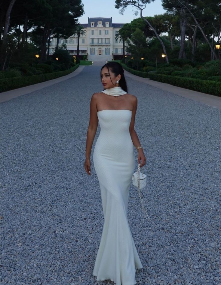 Robe de soirée longue sirène blanche élégante sans bretelles MD7421