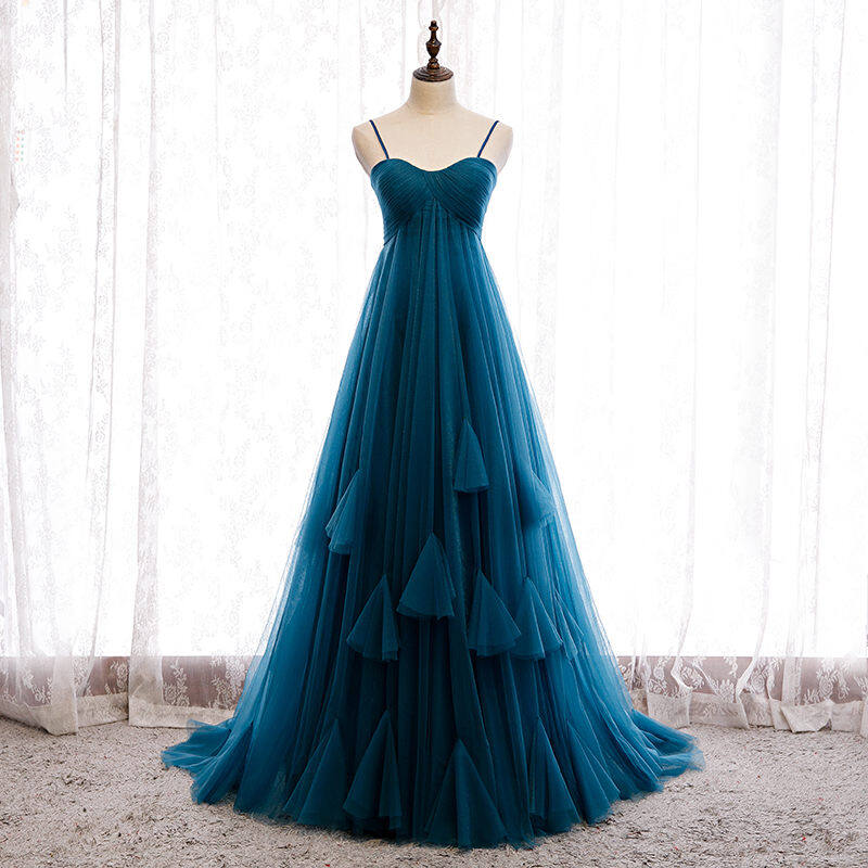 Robe de bal empire bleu encre à bretelles spaghetti M69