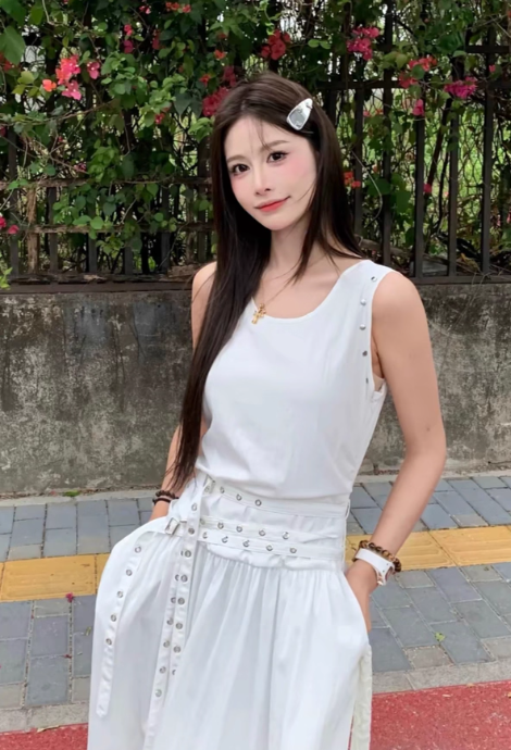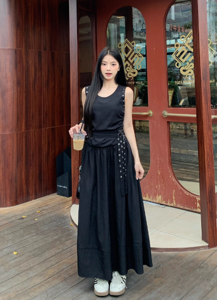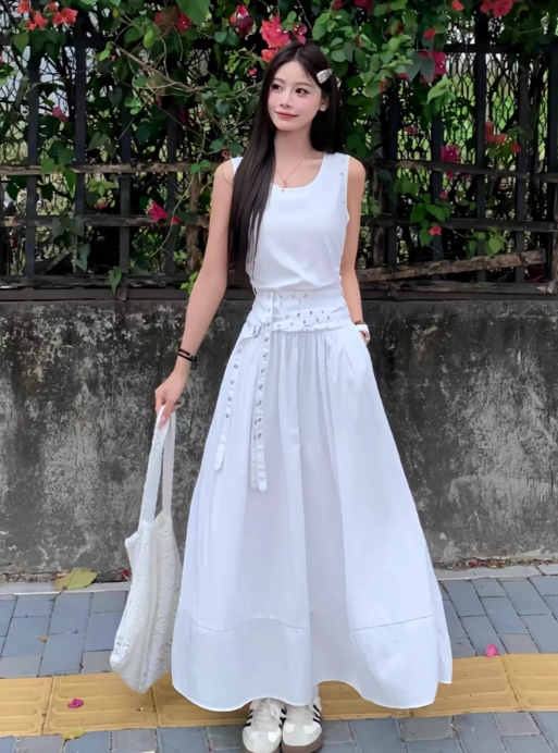 Robe longue plissée à col ras du cou pour femme, tenue d'été tendance avec ceinture cloutée D1913
