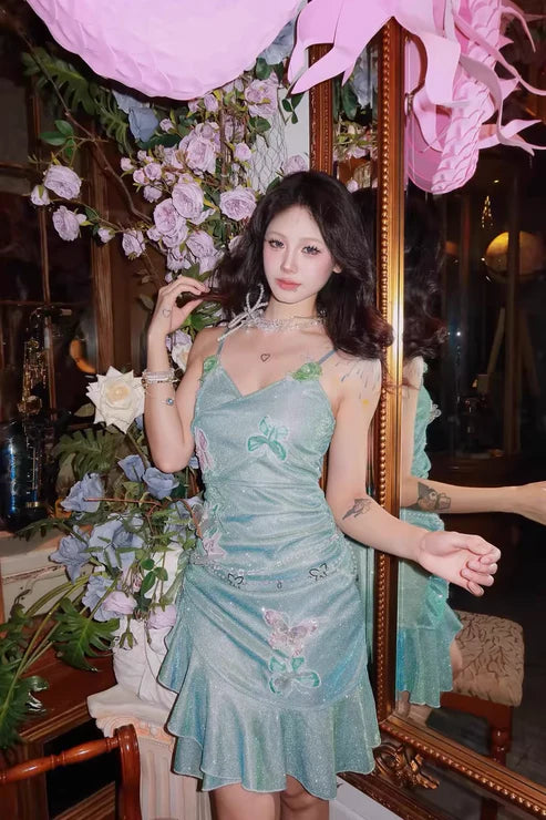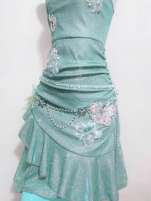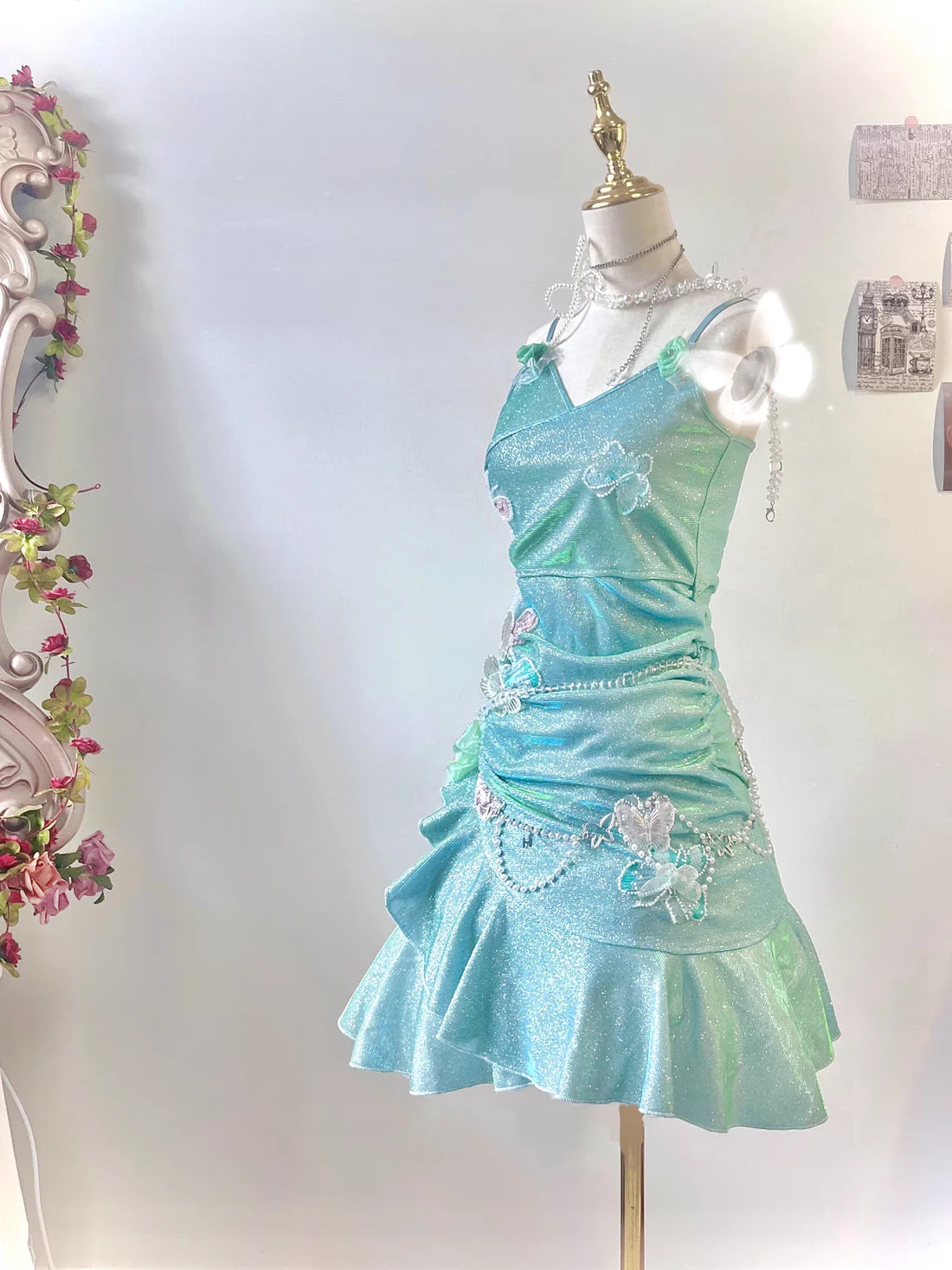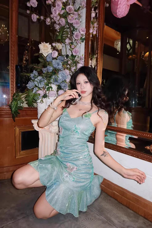 Robe de soirée courte vert menthe à paillettes scintillantes, bretelles spaghetti, ourlet à volants, pour 16e anniversaire, robe de bal D1529
