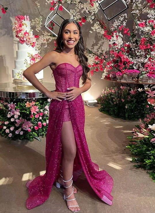 Robe de soirée longue et brillante fuchsia à col en cœur, fourreau, robe de bal formelle, MD7266