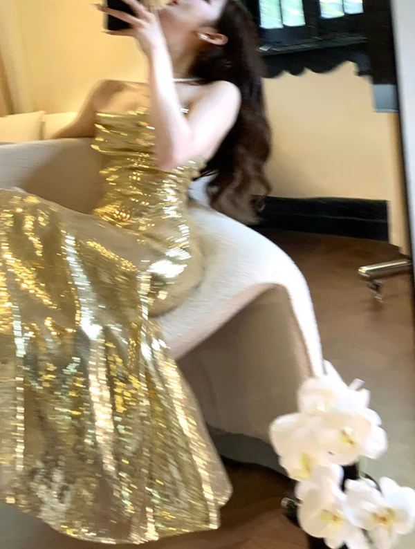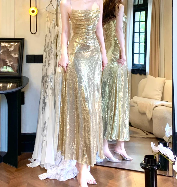 Robe de soirée longue fourreau à paillettes dorées et dos croisé MD7522