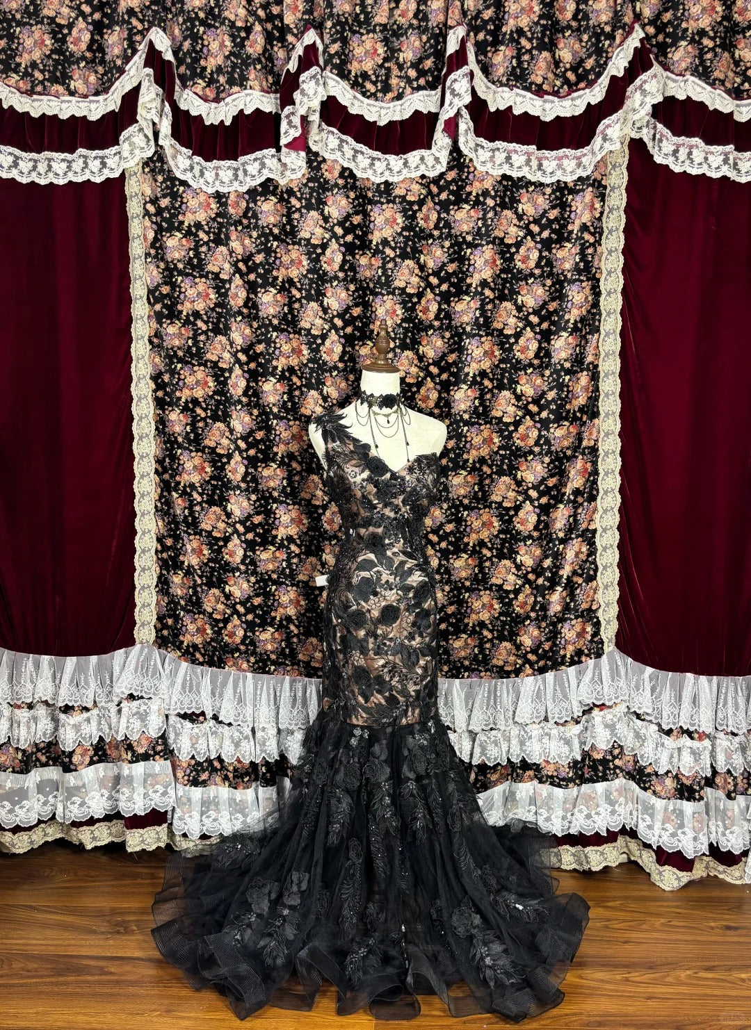 Superbe robe de soirée noire asymétrique brodée de fleurs, longueur au sol, robe de bal, robe de soirée D2227
