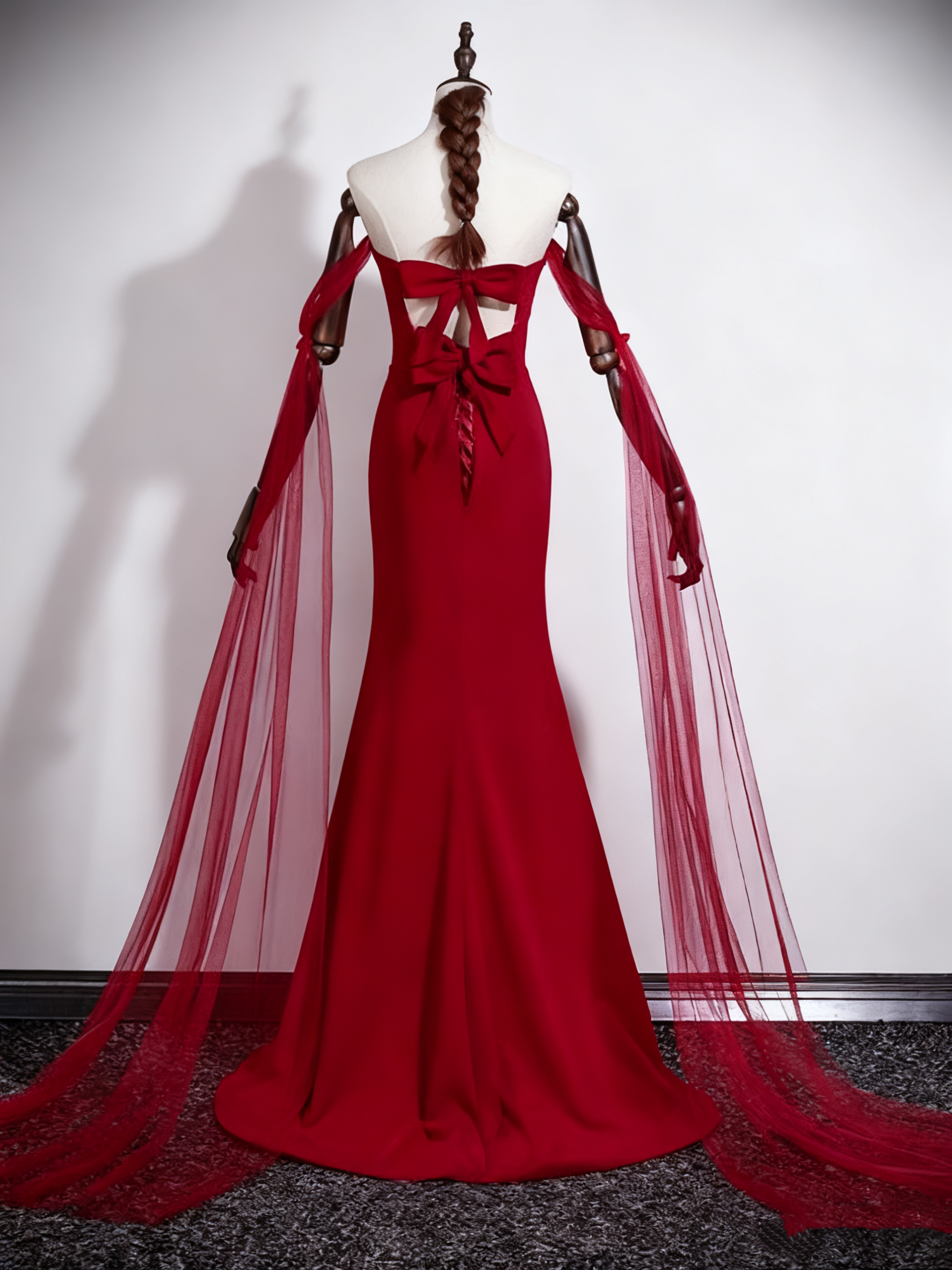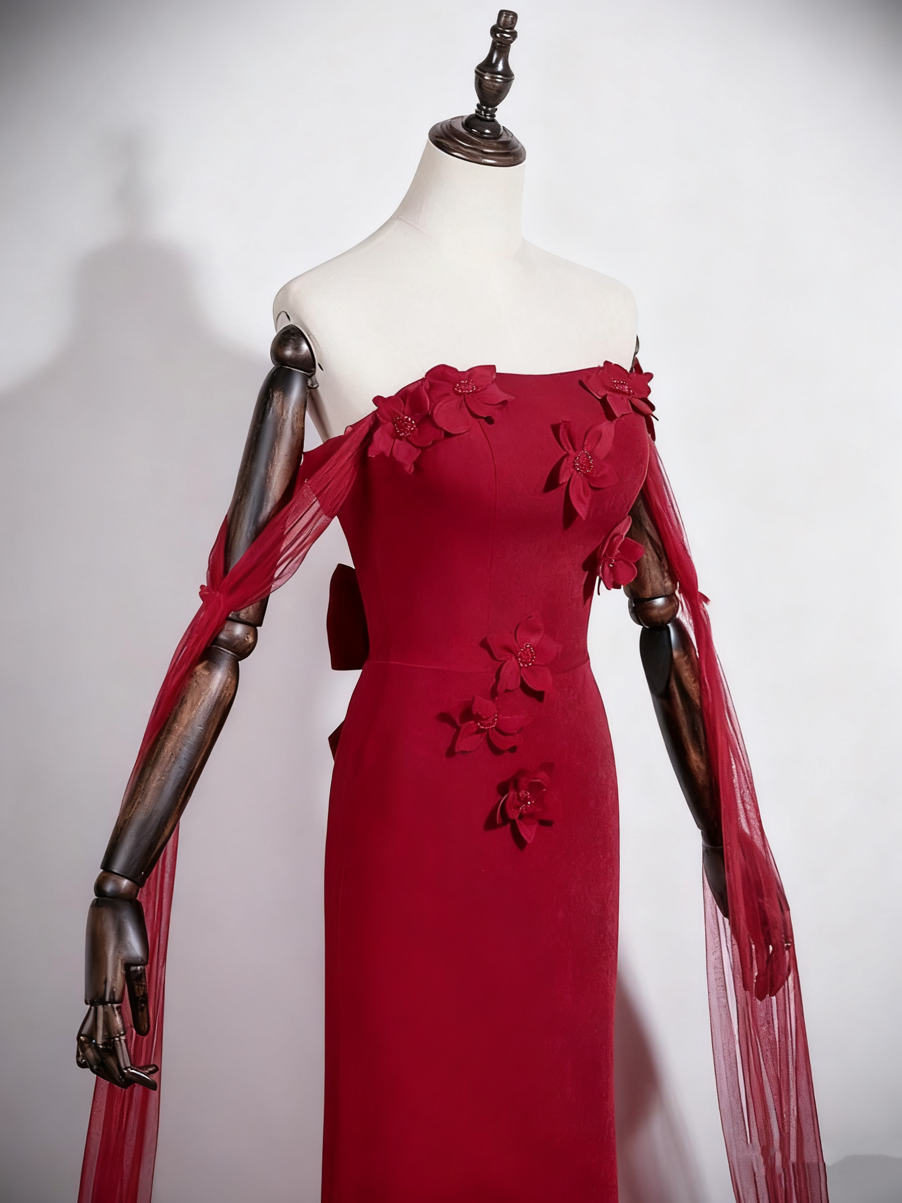 Superbe robe de bal rouge vin, bustier, motif floral, style sirène, D3304