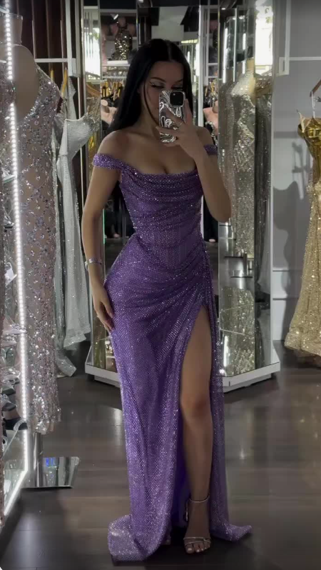 Superbe robe de soirée longue violette à épaules dénudées et style sirène MD7646