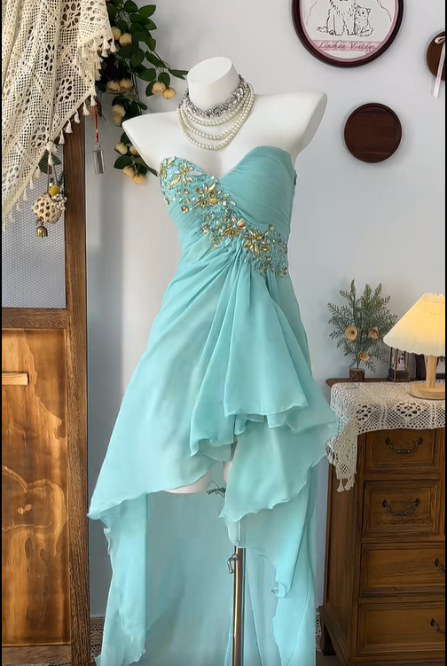 Superbe robe de bal en mousseline de soie sans manches, décolleté en cœur, ornée de cristaux Swarovski D1740