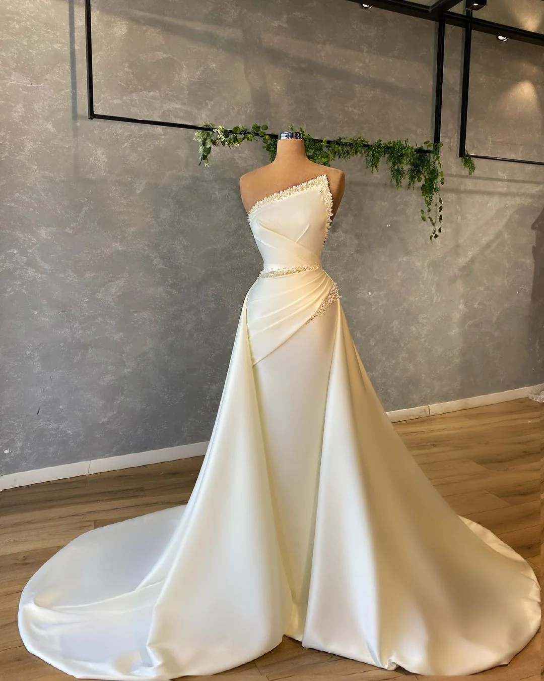 Robe de soirée trapèze élégante en satin ivoire, sans bretelles, plissée et ornée de perles, robe de bal M5898