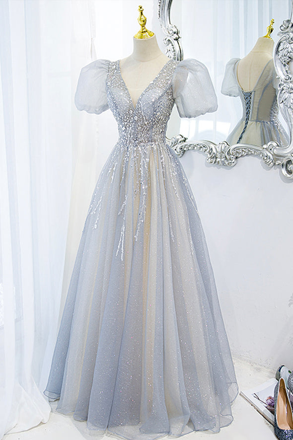 Robe de soirée longue en tulle gris avec perles M5311