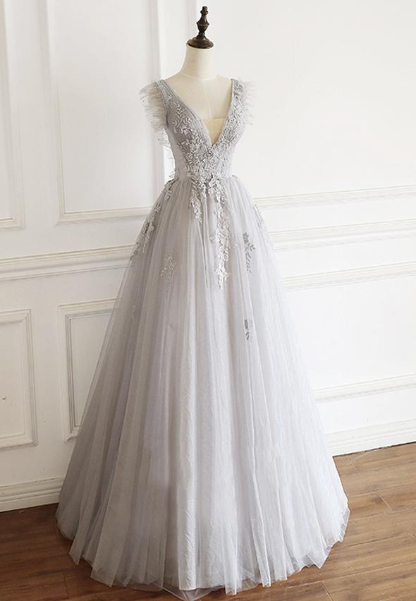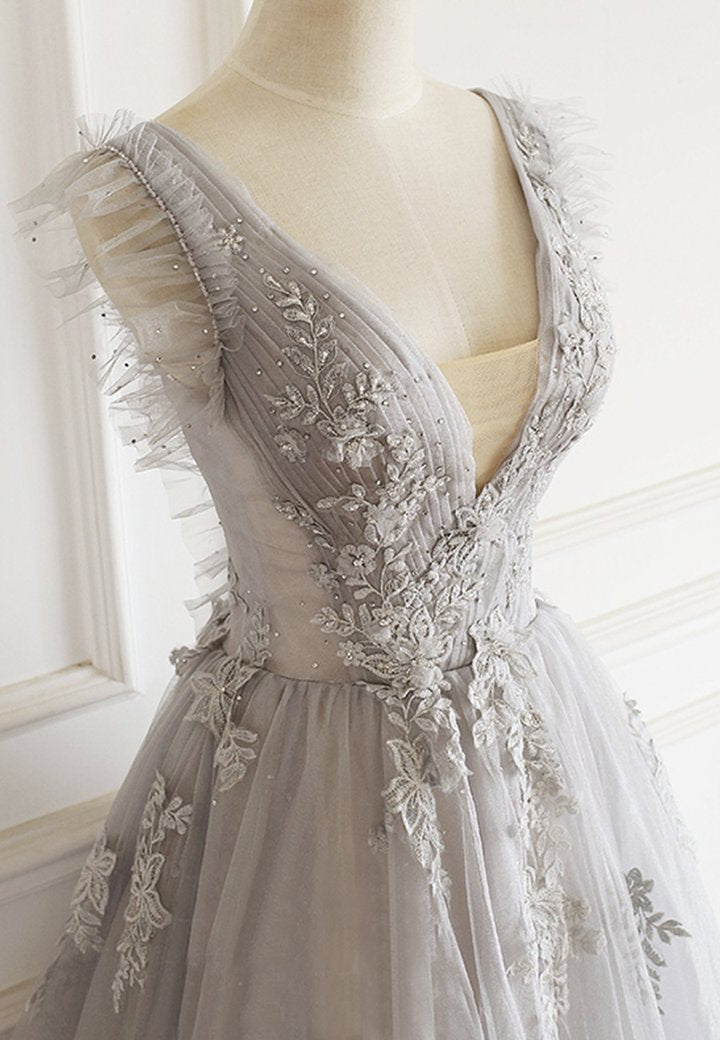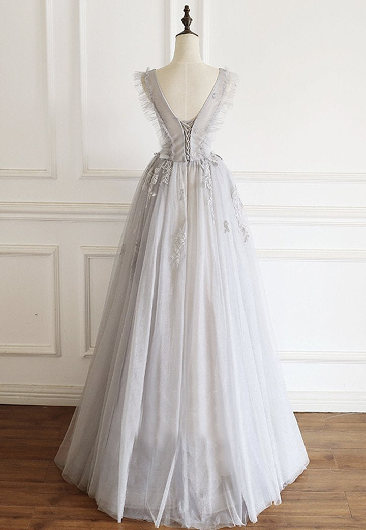 Robe de soirée grise en tulle et dentelle à col en V M821