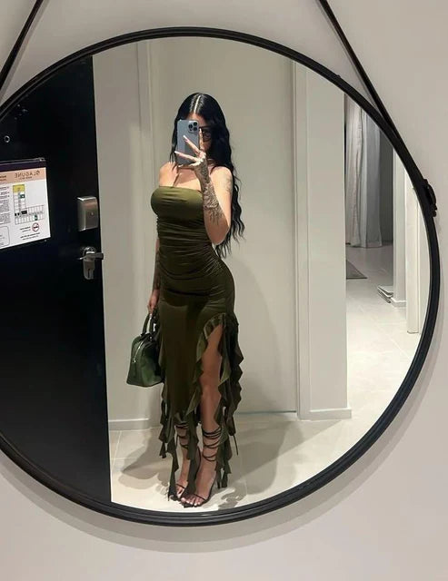 Robe de soirée longue bustier fourreau verte à volants, robe d'invitée de mariage, D291