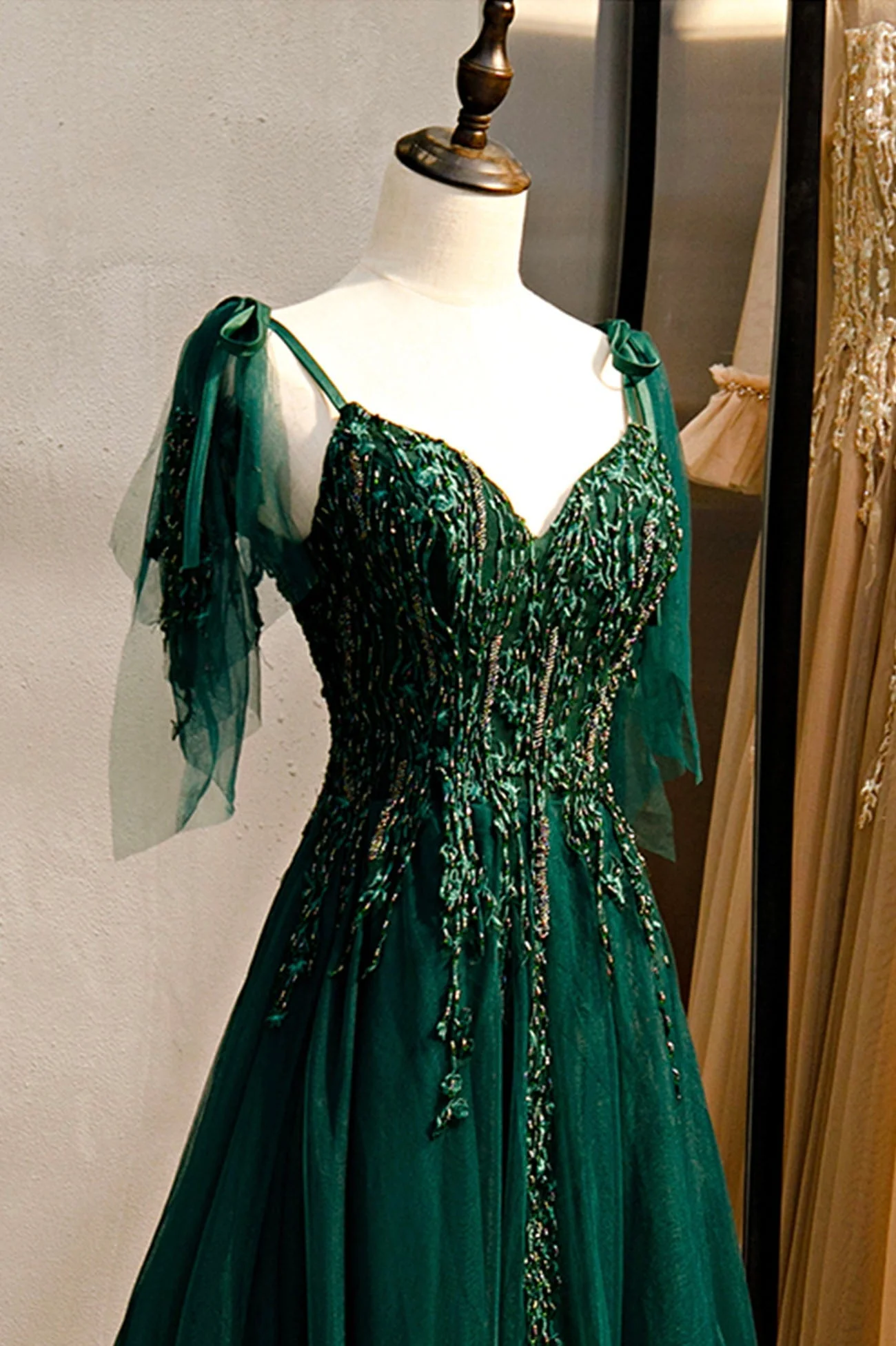 Robe de bal longue verte en dentelle à col en V et bretelles spaghetti, robe de soirée trapèze MD7254