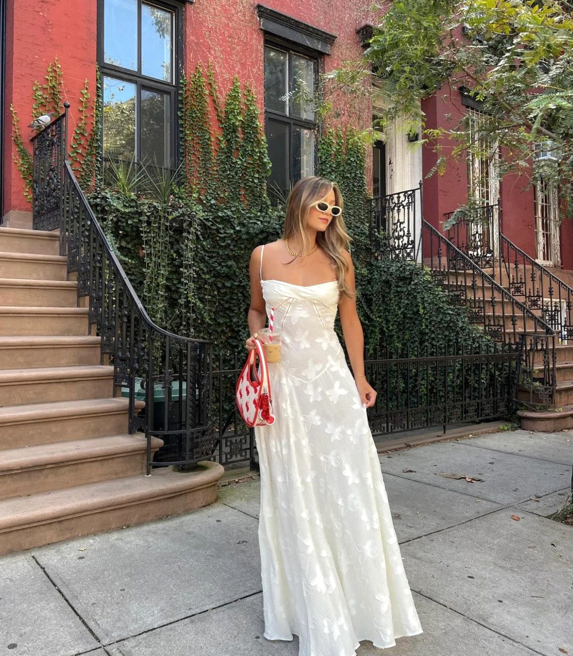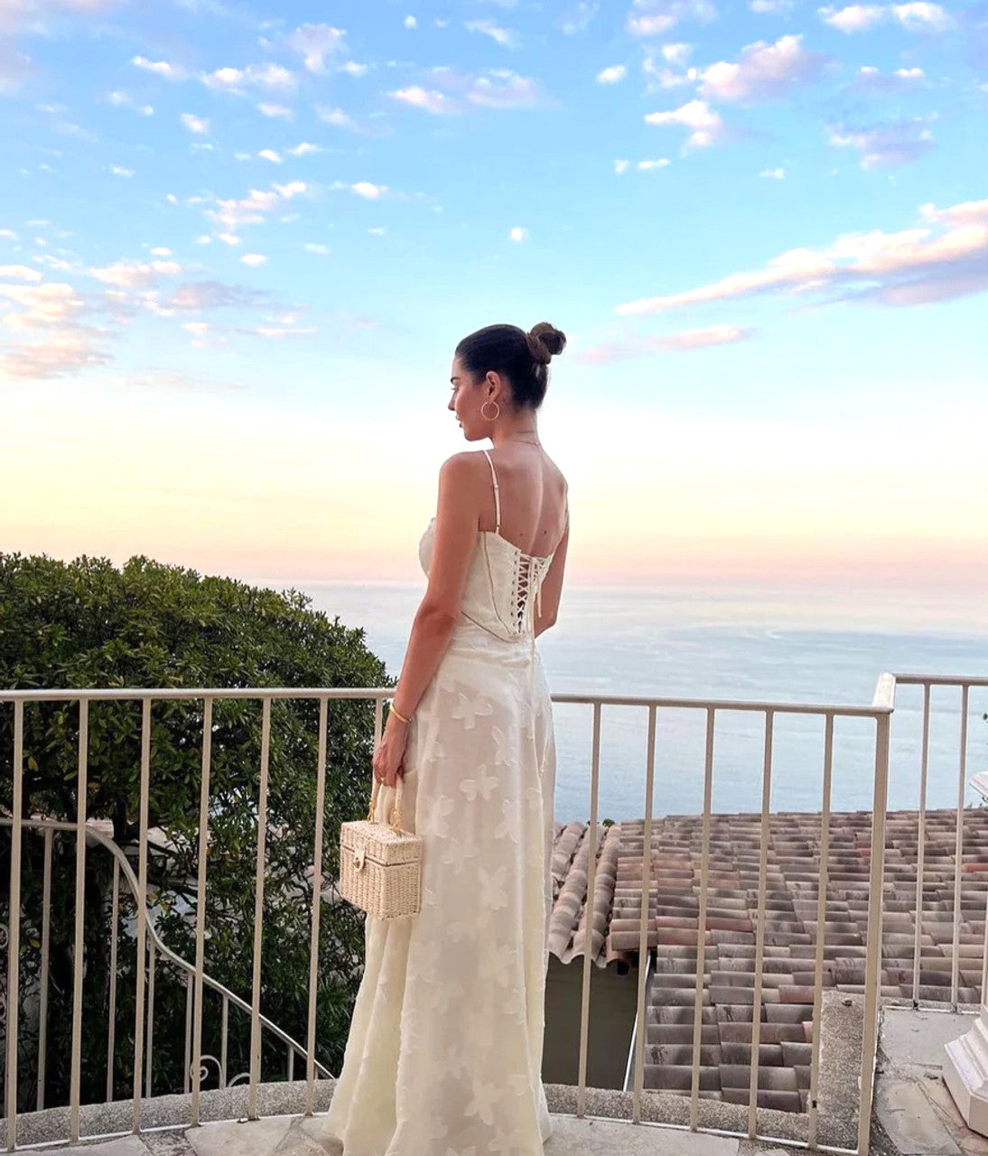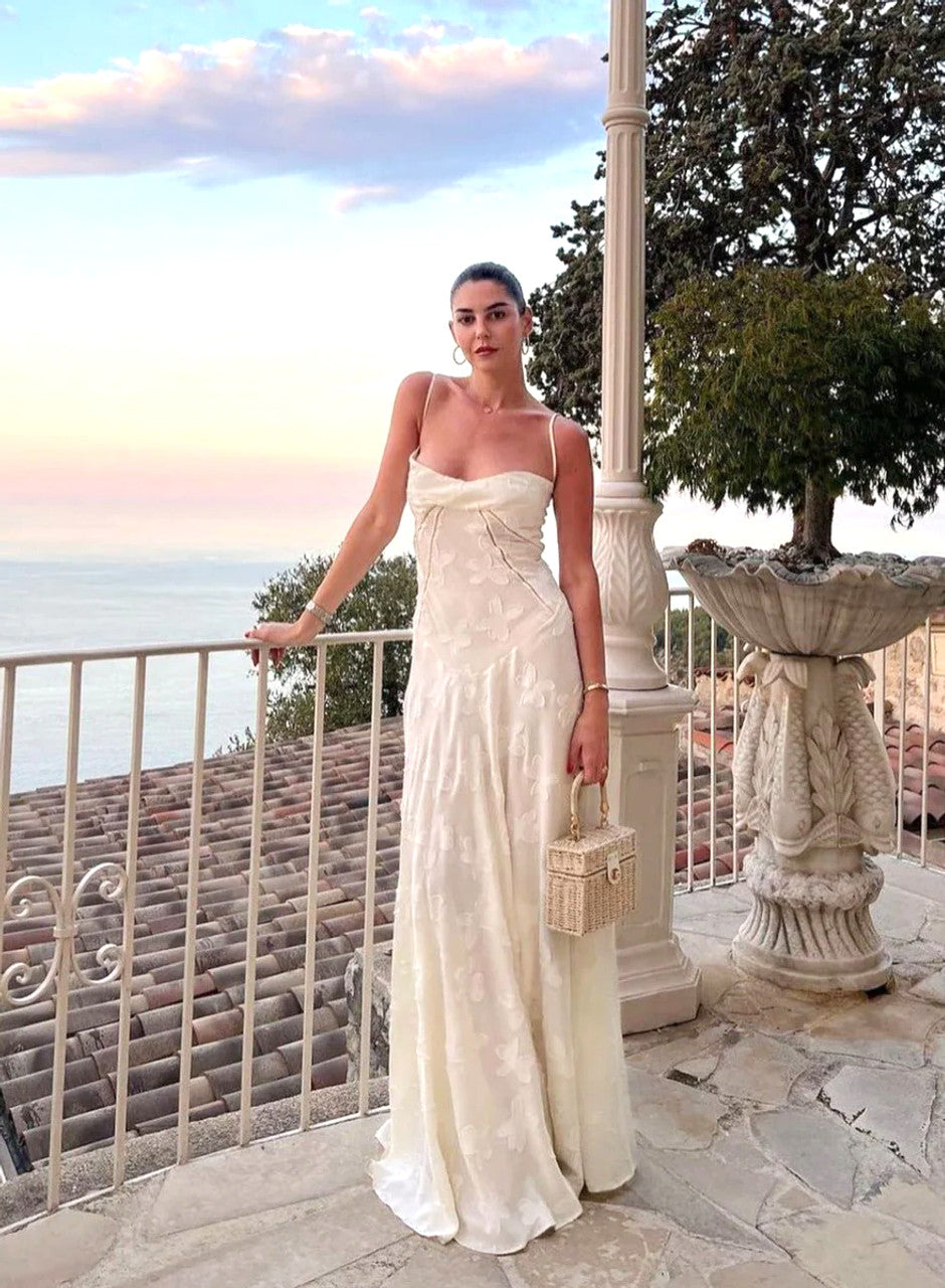 Robe de soirée longue ivoire à bretelles trapèze, robe d'invitée de mariage, D49