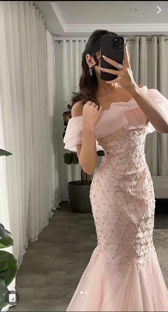 Robe sirène longue rose clair à épaules dénudées, tenue de soirée d'anniversaire MD7678