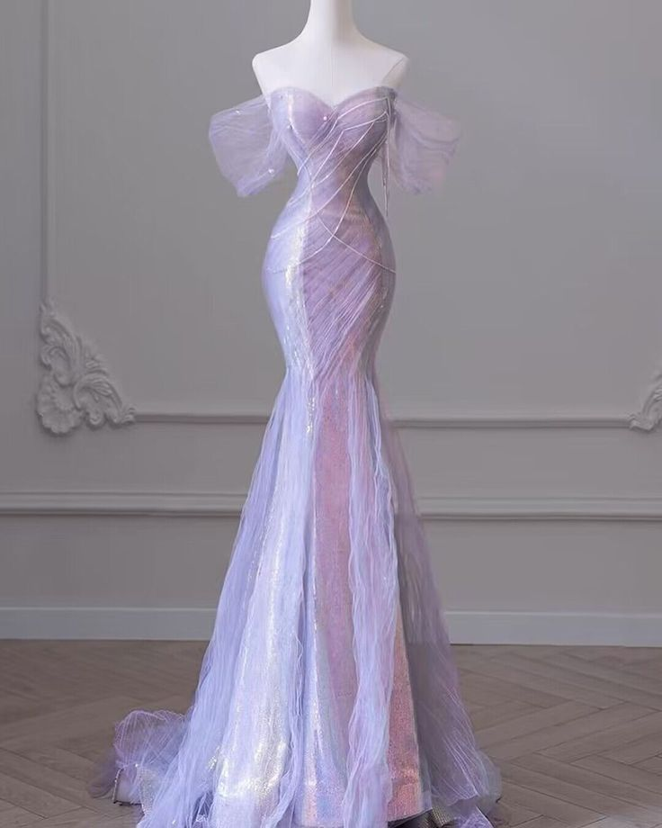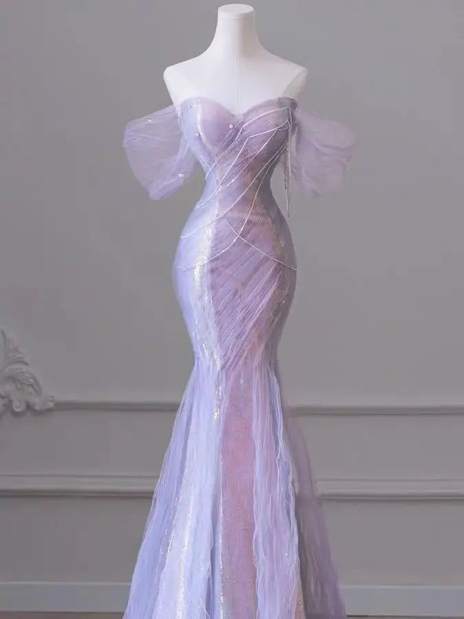 Robe de soirée longue sirène violet clair à épaules dénudées MD7523