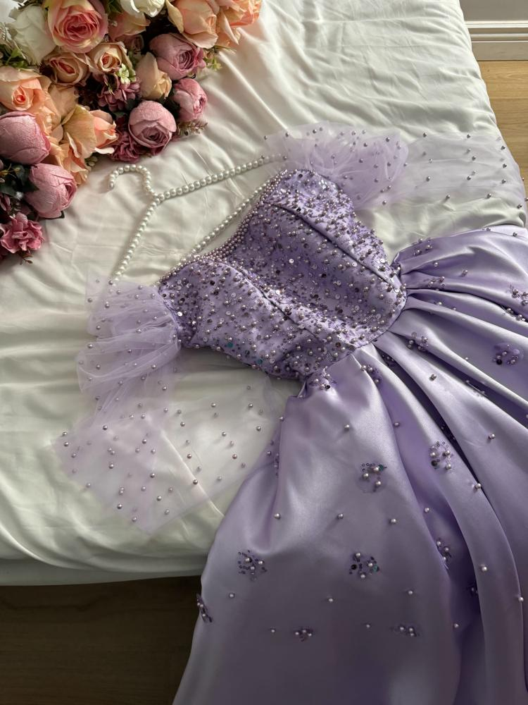 Robe de bal longue en satin lilas, coupe trapèze, manches longues, avec perles, MD7957
