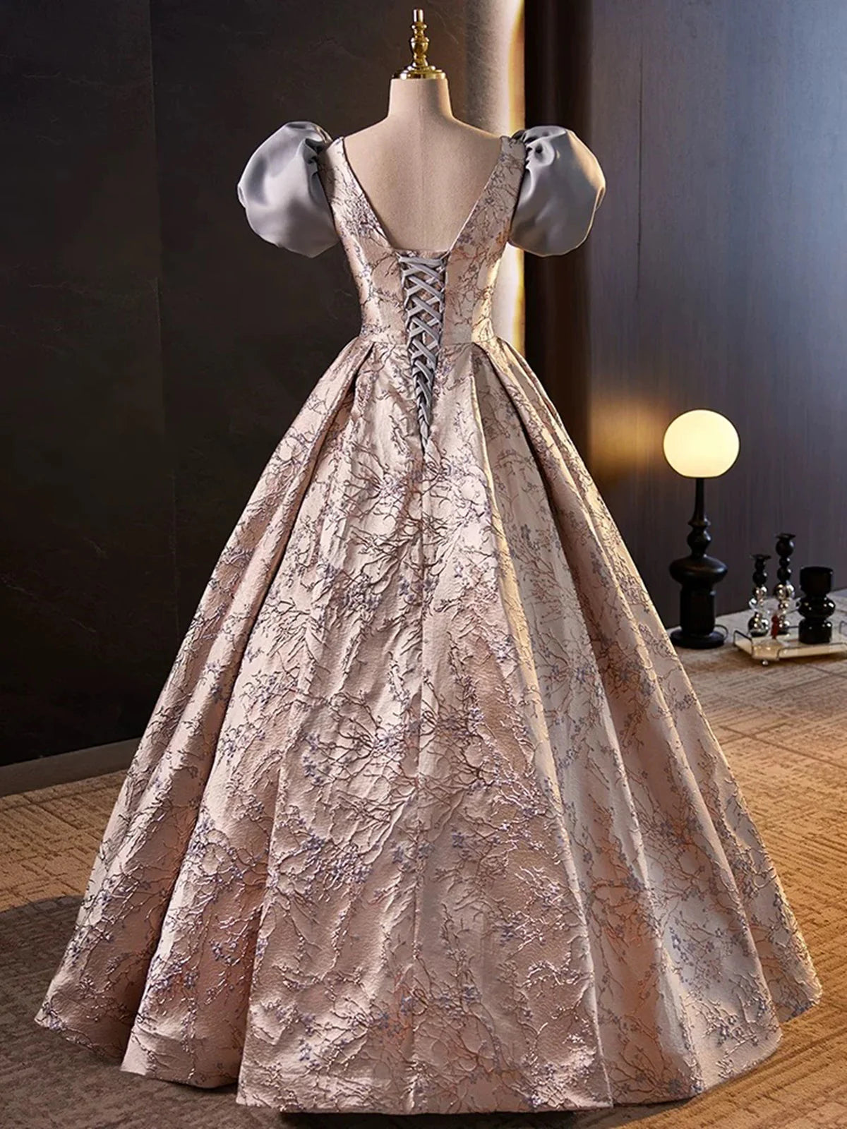 Robe de bal longue en satin à fleurs, coupe trapèze, manches courtes, MD7618