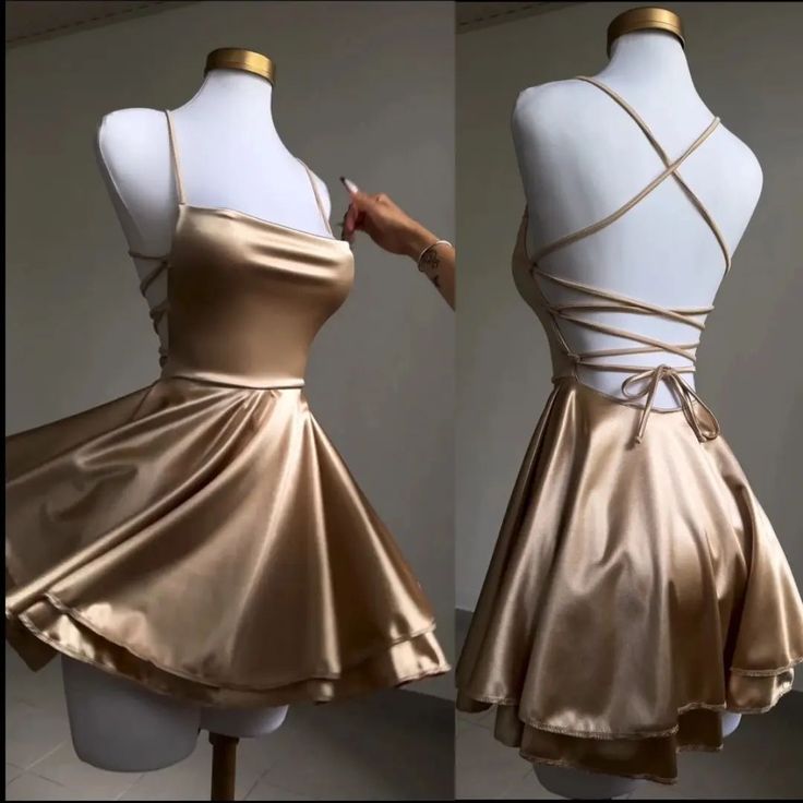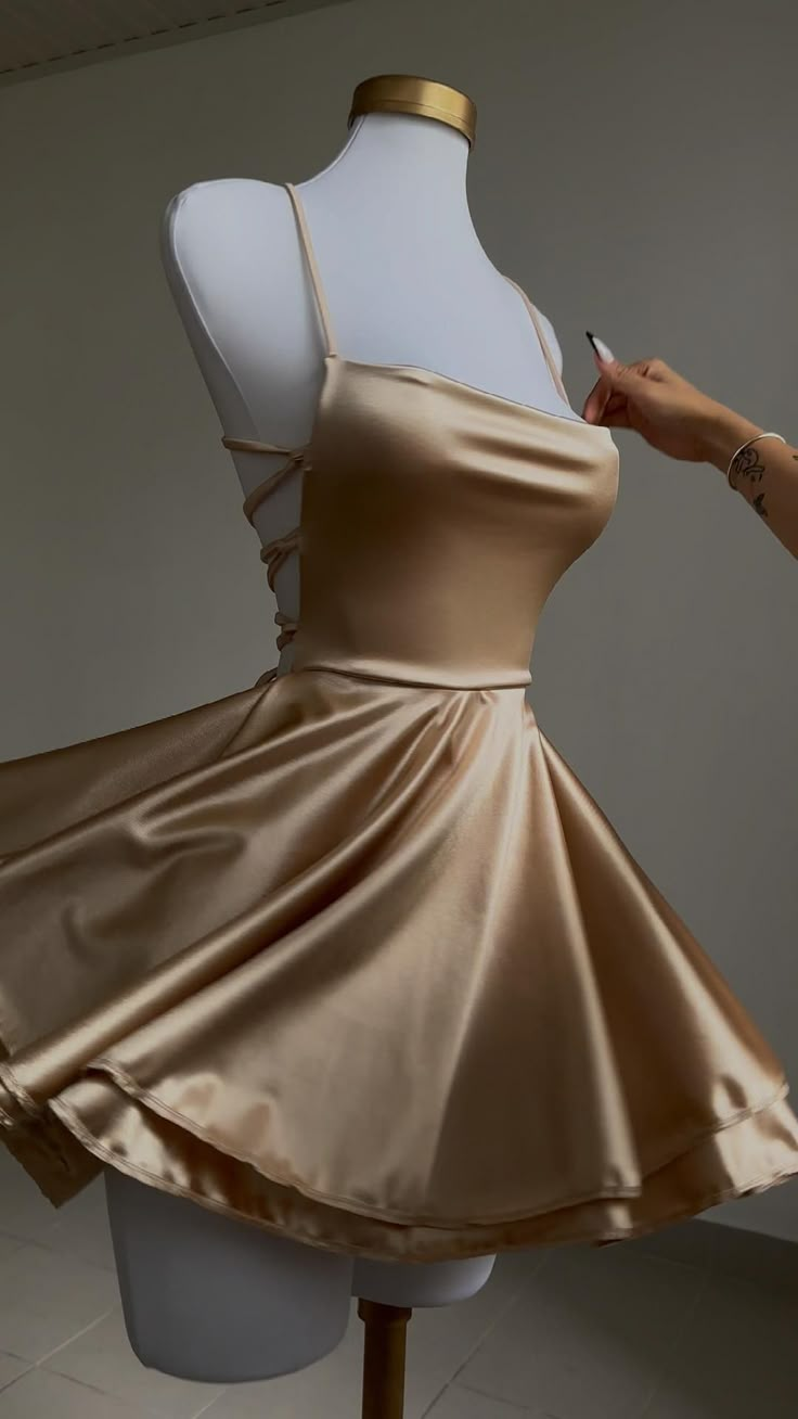 Robe de soirée courte en satin à bretelles dorées, coupe trapèze, MD7467