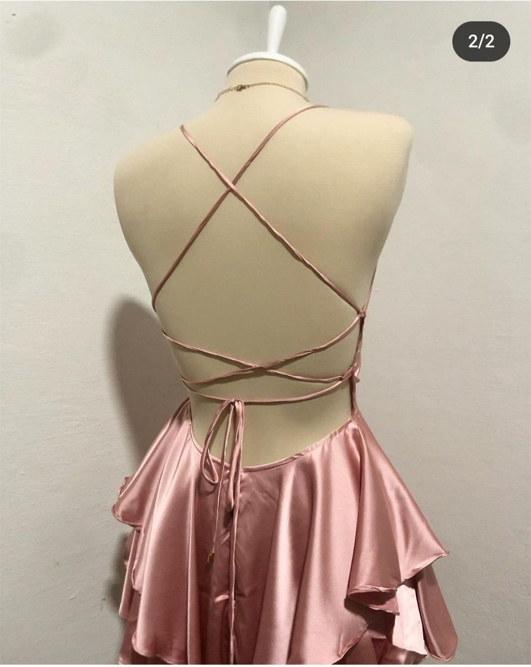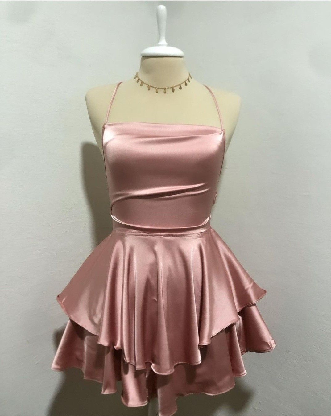 Robe de soirée courte en satin rose à bretelles, coupe trapèze, MD7466