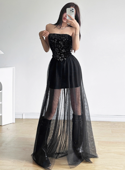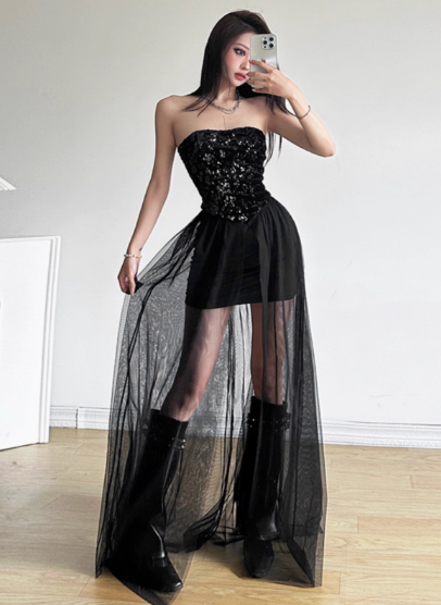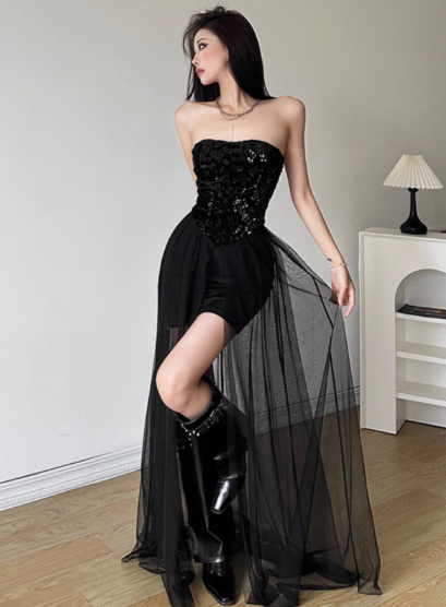Robe bustier plissée en tulle noir brillant minimaliste, à volants, pour soirée, été, D1841