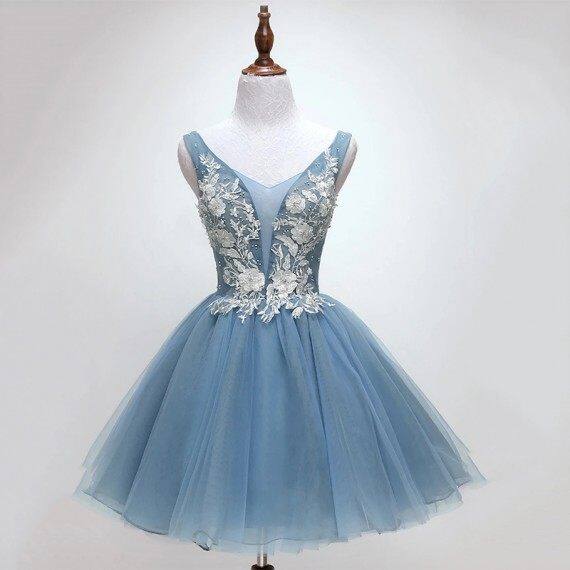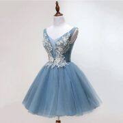 Robe de soirée courte bleu brumeux avec fleurs 3D M994