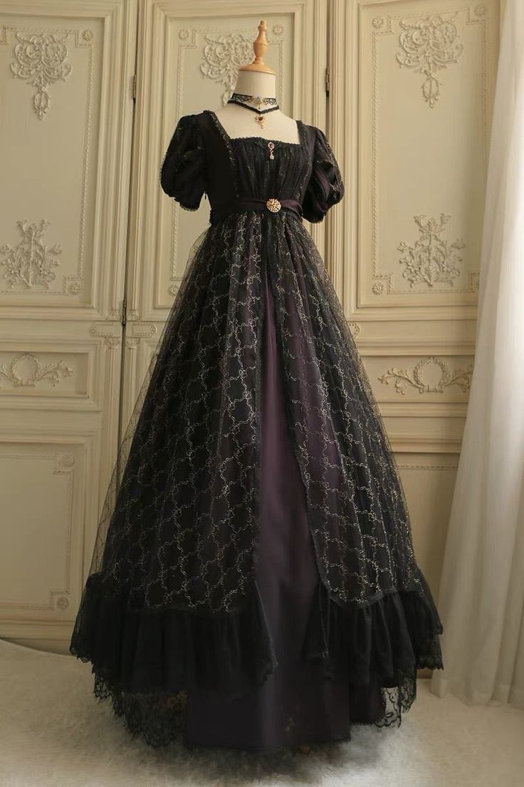 Robe de bal trapèze noire modeste en satin et dentelle, longue, style vintage, D921