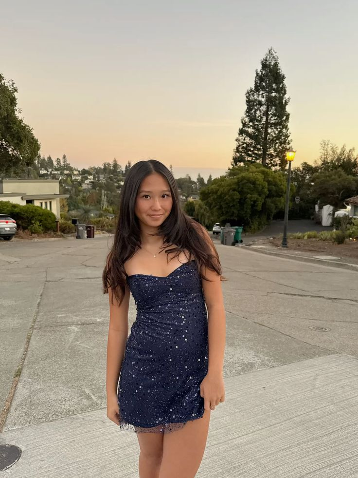 Robe de soirée courte bleu marine à bretelles et paillettes, D1316