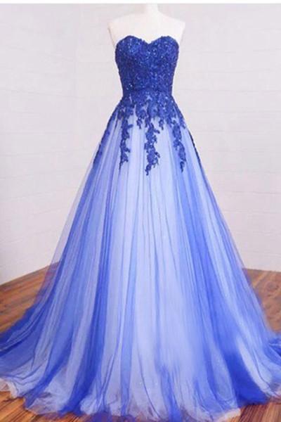 Robe de bal bleu roi, décolleté en cœur, sans bretelles, avec appliques en dentelle, robe de soirée simple, M1277