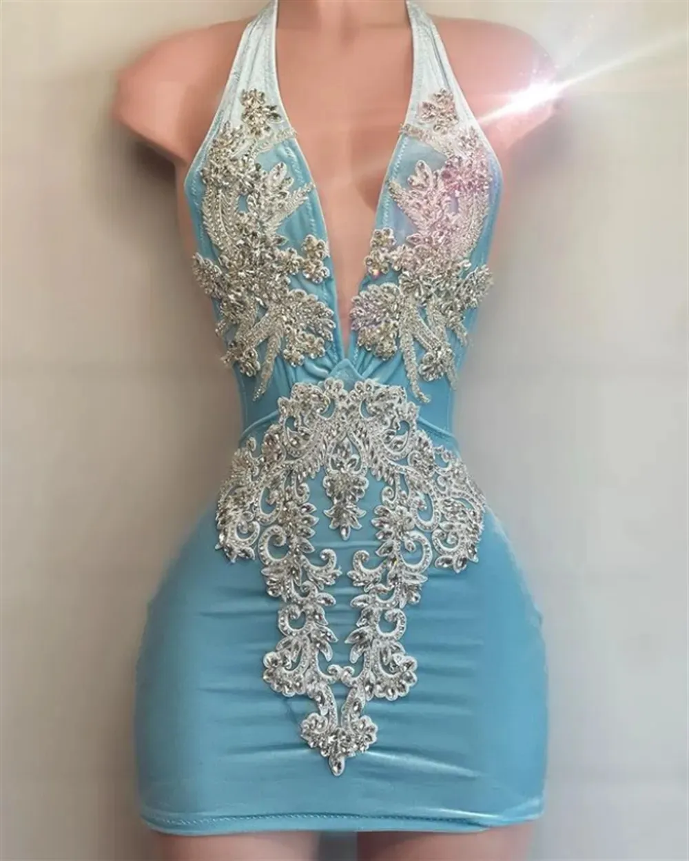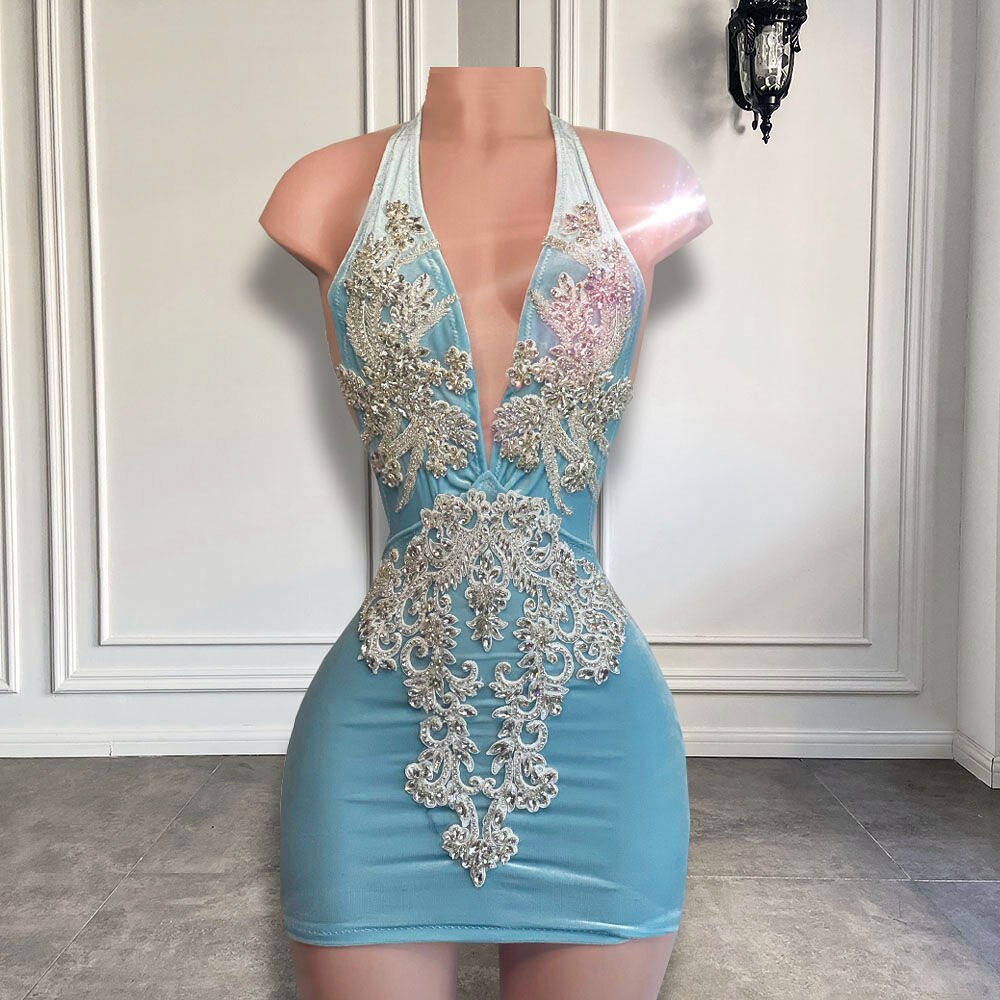 Robe de soirée courte à col en V et perles argentées scintillantes pour femme, MD6975