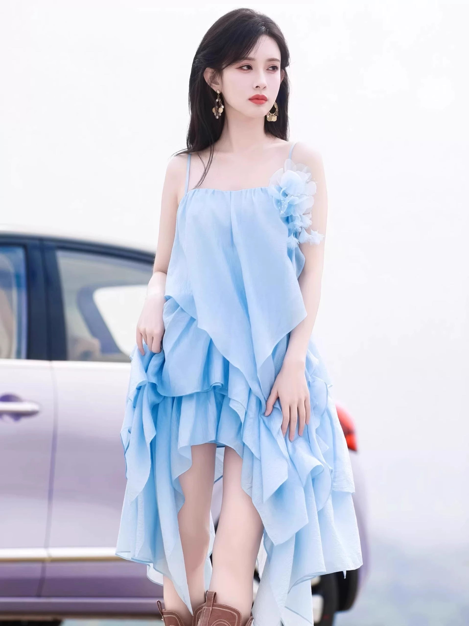 Robe de soirée d'été tendance bleu clair à bretelles spaghetti et ourlet irrégulier, motif floral 3D, D1444