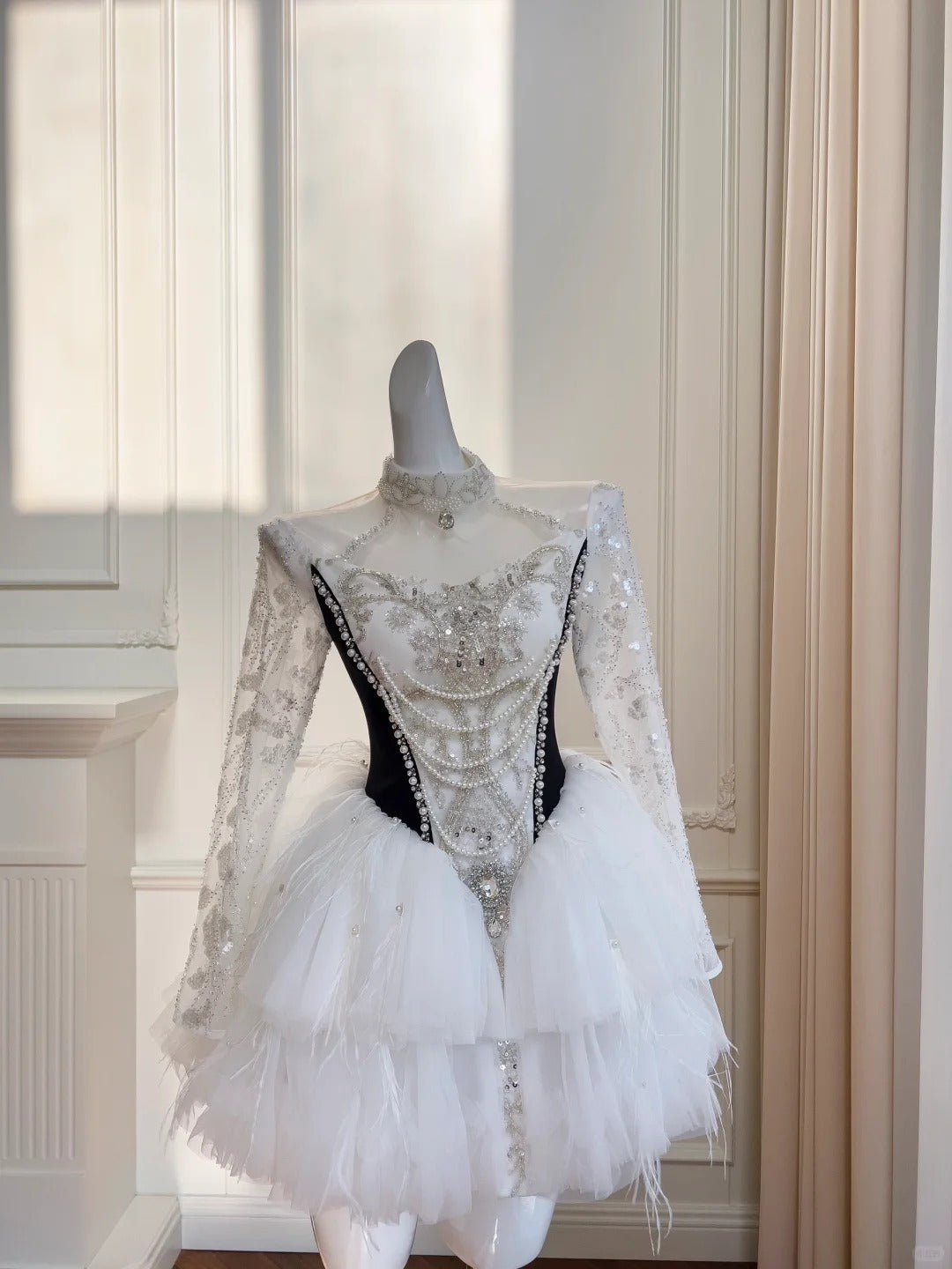 Robe de soirée à col montant et manches longues en tulle, plumes, perles, paillettes et cristaux, à plusieurs niveaux, pour fête de 16 ans, D1873