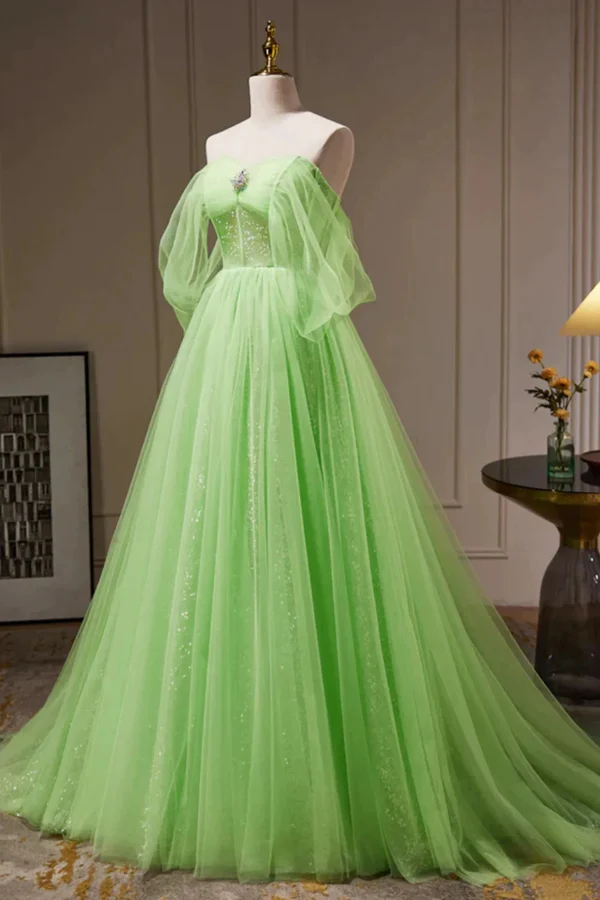 Robe de bal longue en tulle, épaules dénudées, coupe trapèze, verte, à paillettes, MD7224