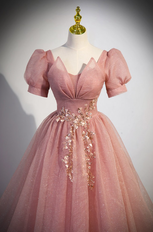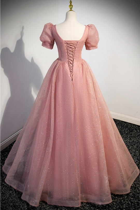 Robe de bal longue rose trapèze en tulle scintillant à manches courtes MD7302