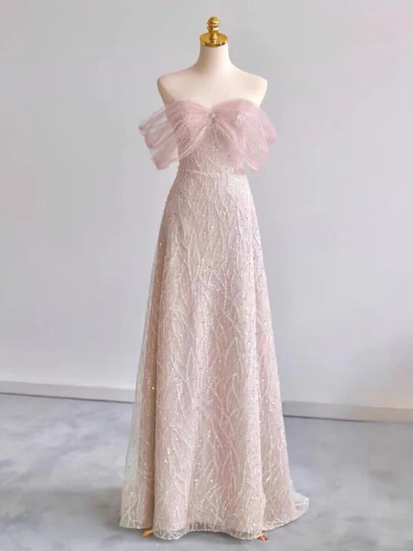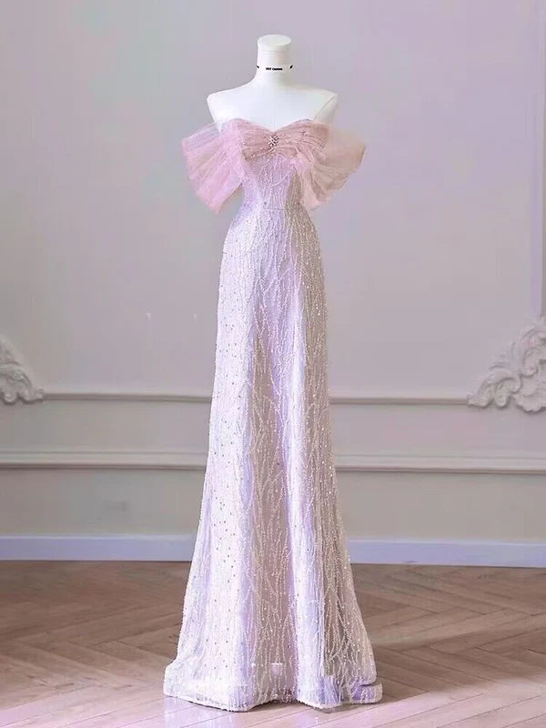 Robe de bal longue rose à paillettes, coupe trapèze, épaules dénudées, tenue d'anniversaire, MD7663