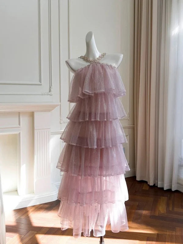 Robe de soirée rose à dos nu et coupe trapèze, effet superposé, brillante, tenue d'anniversaire, MD7688