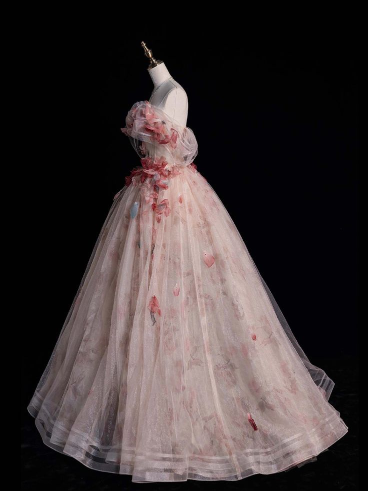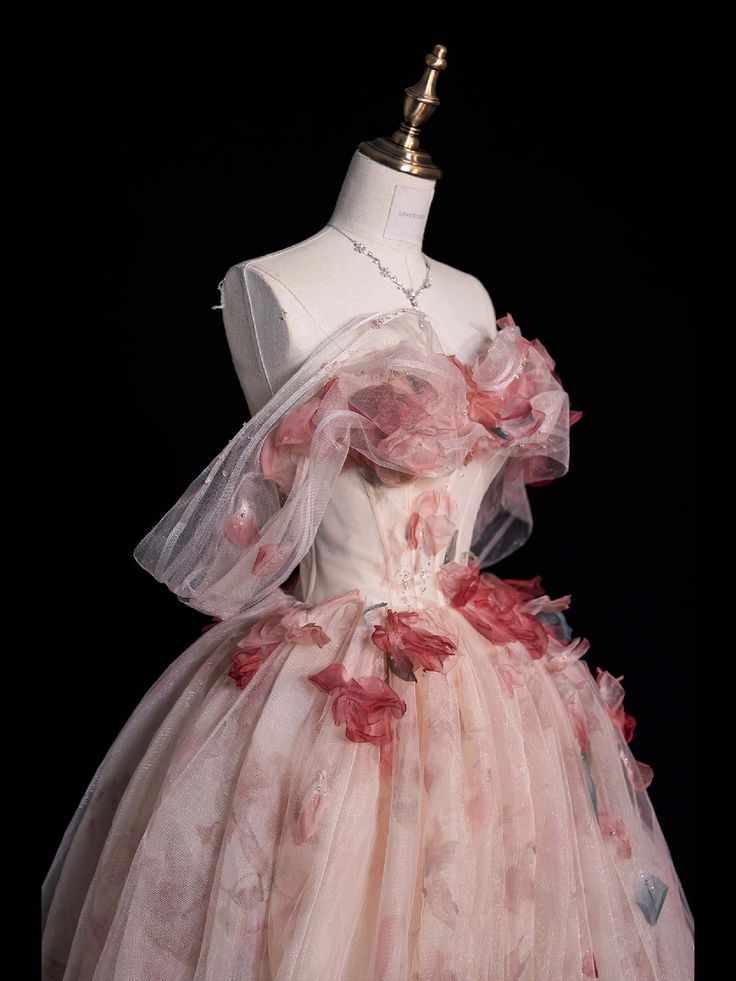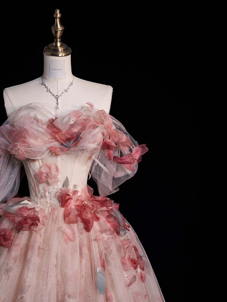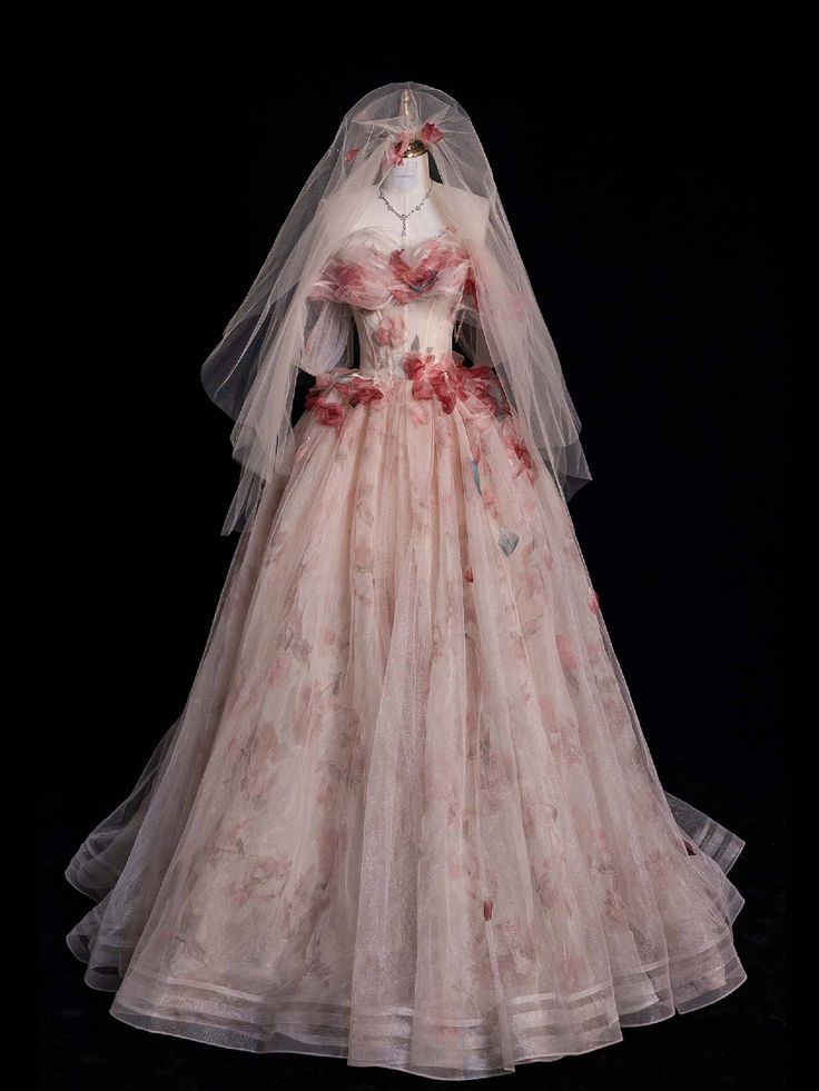 Robe de mariée longue en tulle à fleurs, coupe trapèze, épaules dénudées, rose, MD7950