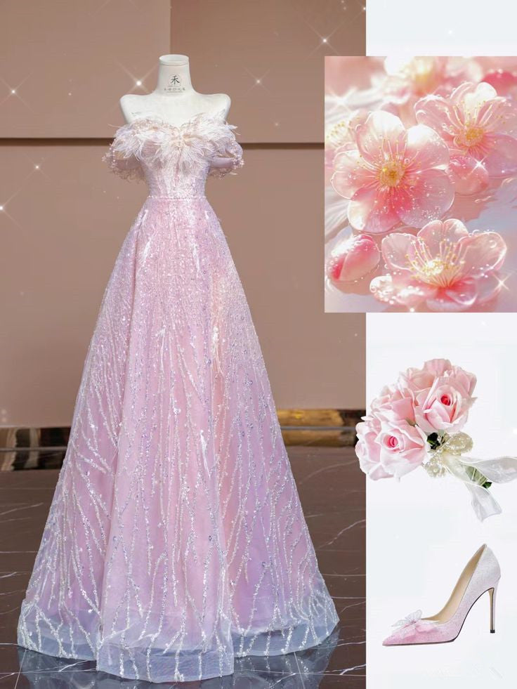 Robe de soirée longue rose à épaules dénudées et paillettes, MD7867
