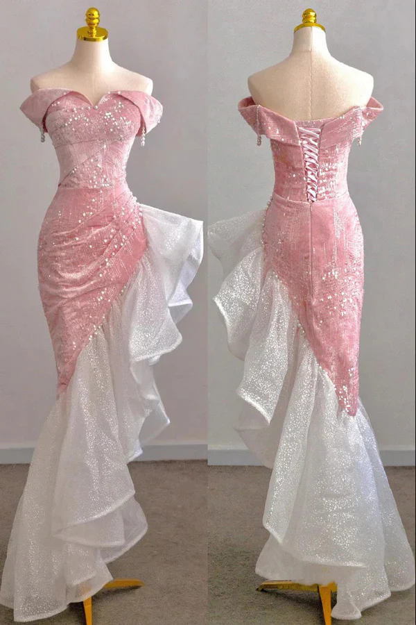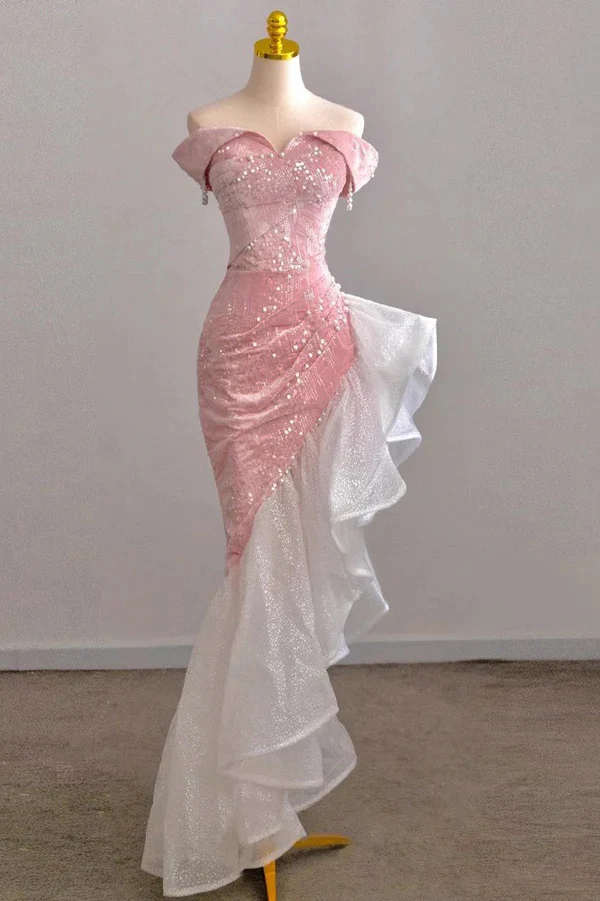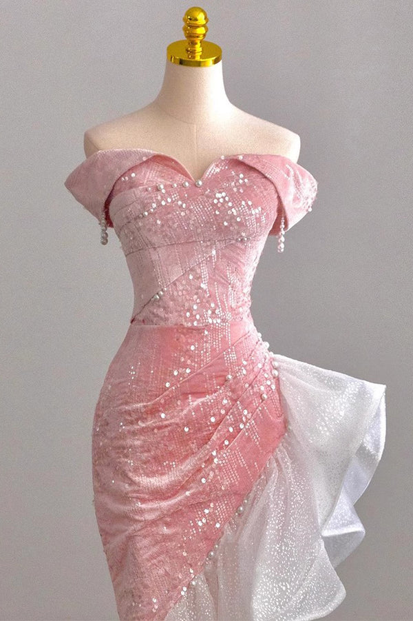 Robe de bal sirène rose à épaules dénudées et paillettes, robe de soirée scintillante MD7290
