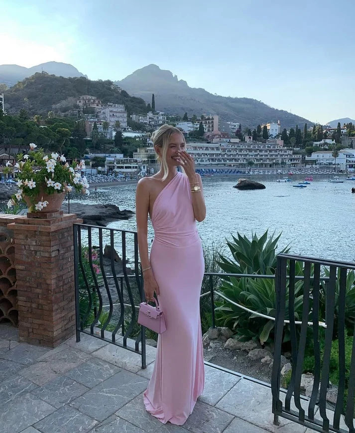 Robe de bal sirène longue rose à une épaule, robes de demoiselle d'honneur, D93
