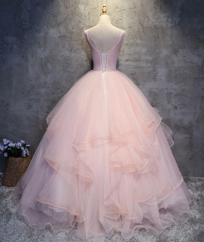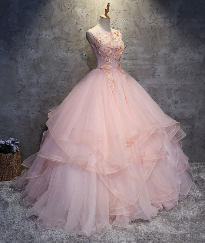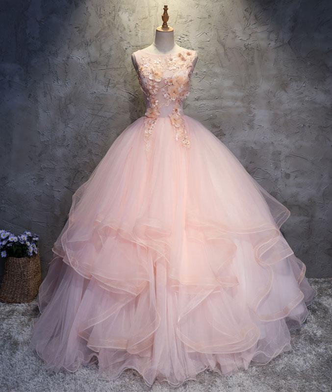 Robe de bal longue rose à col rond et appliques en dentelle et tulle, robe de soirée rose M4834