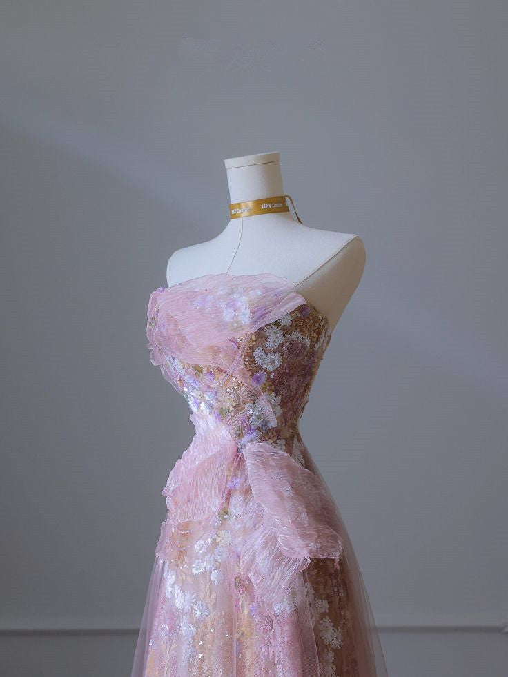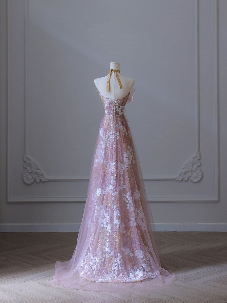 Robe de soirée longue rose bustier à imprimé floral, MD7935
